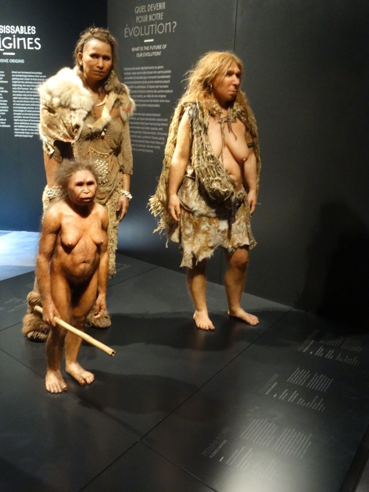 Au début une vitrine avec trois espèces humaines : l'homme de Florès, l'homme de Neandertal, l'homme moderne.
