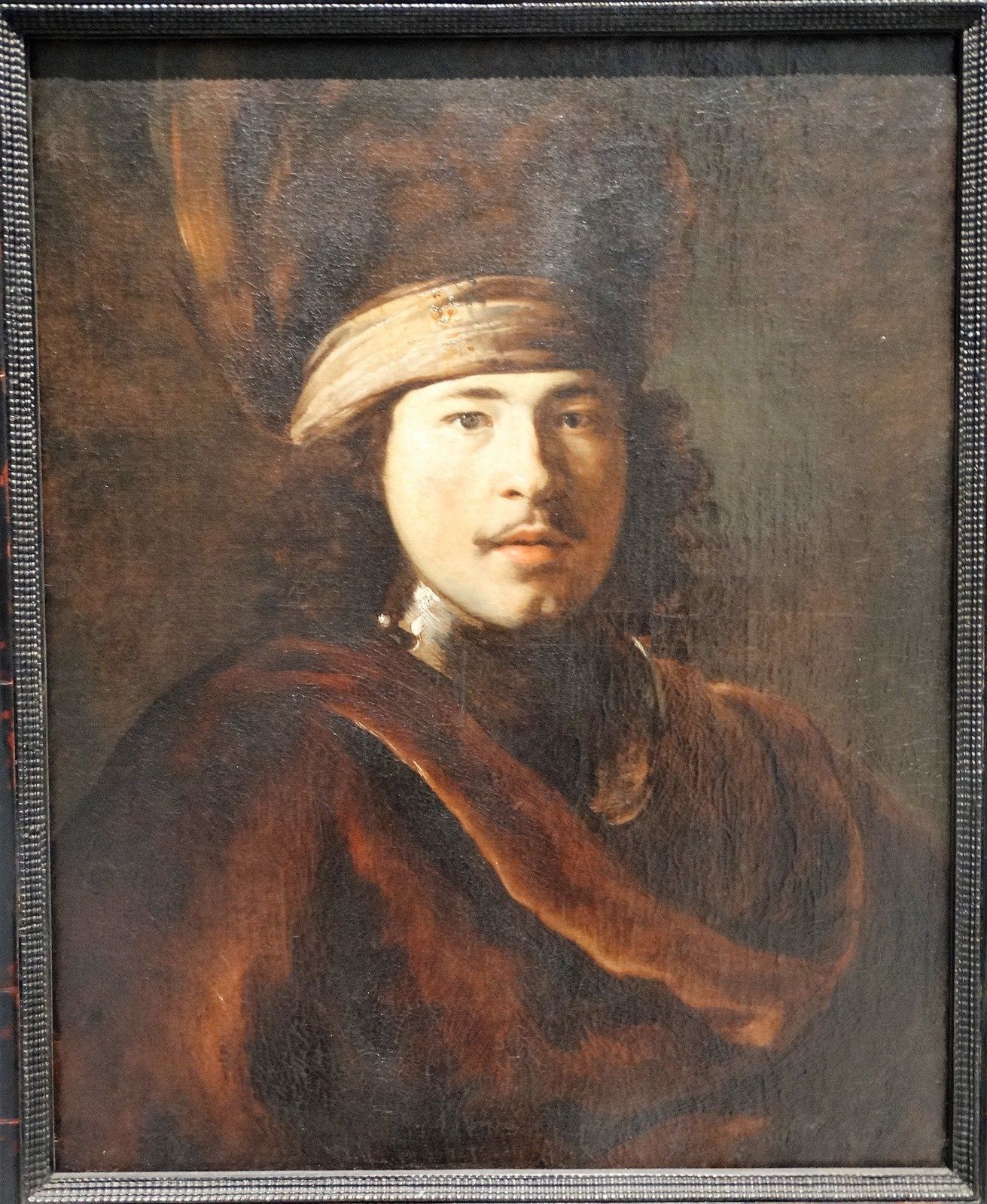 Le fond juste derrière la tête de l'homme à un aspect curieux. On dirait qu'il y a une espèce d'incendie derrière ce qui parait ressembler à un tissus, une toile assez rigide.