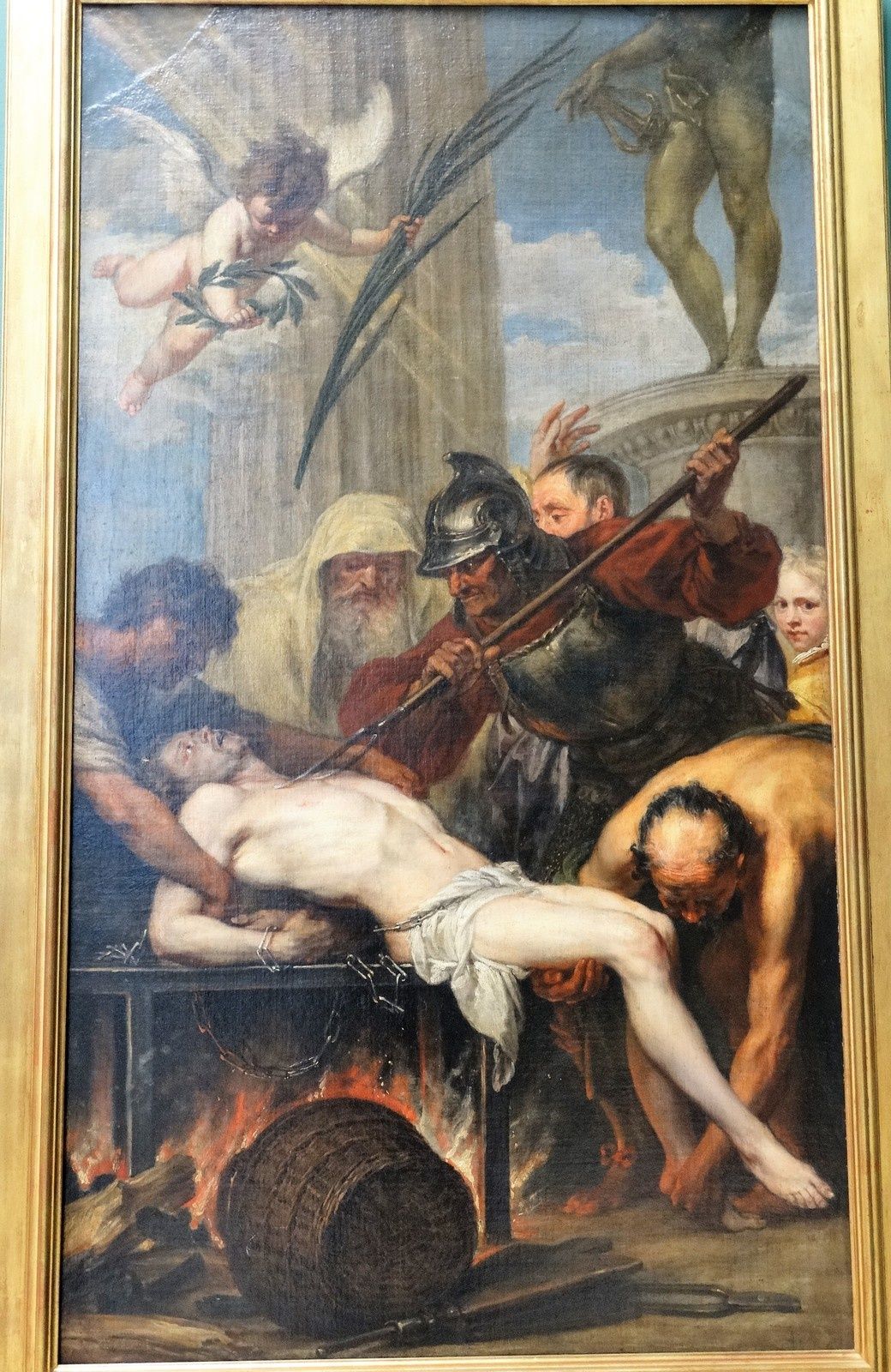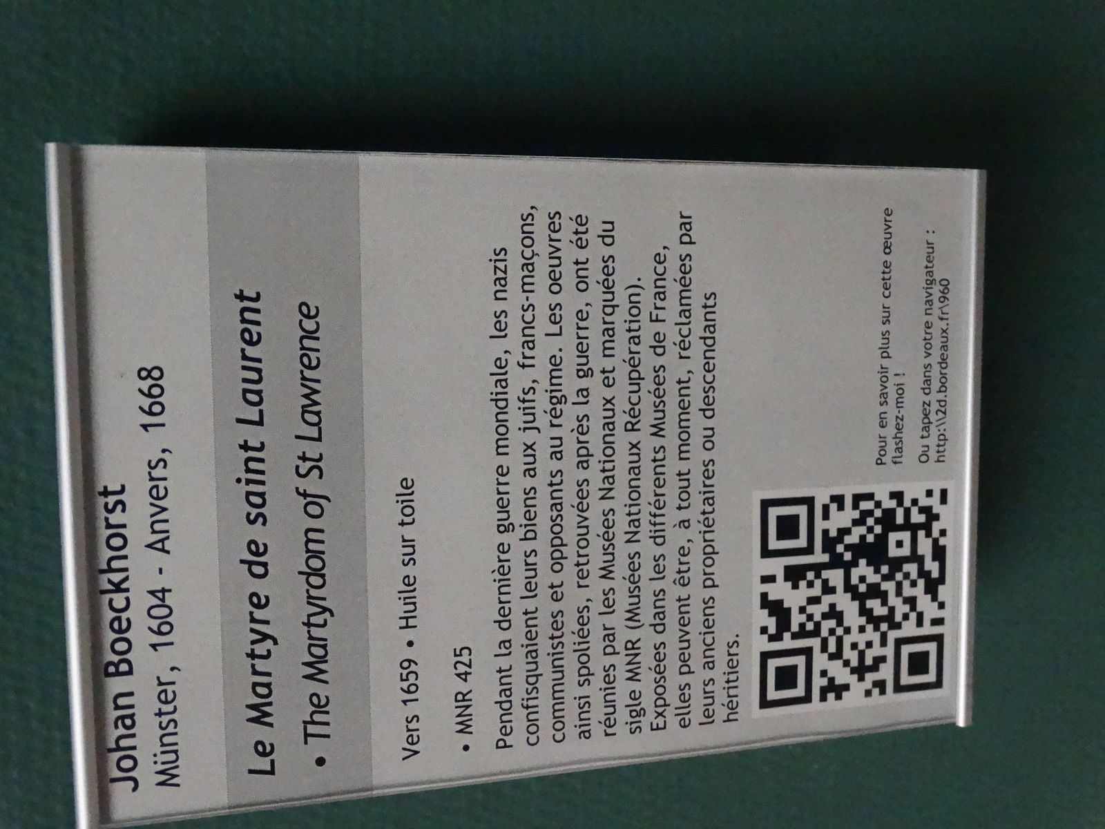 Voilà l'affiche. On peut voir en bas à droite de l'affiche qu'on peut en savoir plus sur cette œuvre en flashant le QR Code ou en tapant sur son navigateur une adresse URL. Bizarrement j'ai tapé cette adresse mais la réponse que j'ai eu c'est "que l'accès à cette page ne m'est pas autorisé". Je me demande bien pourquoi alors le musée des Beaux-Arts de Bordeaux à cru bon de mettre cette indication ? Ce que j'ai pu apprendre par ailleurs c'est qu'elle aurait été peinte entre 1649 et 1659 pour l'abbaye de Tongerlo. Abbaye détruite en 1796. L'œuvre aurait été vendue à Lille en 1881 avec la collection Tencé". Johan Boeckhorst est un peintre qui bien que né en Allemagne est considéré comme un peintre flamand. Il aurait collaboré avec Paul Rubens et était l'ami de Van Dick. Il est mort a Anvers.