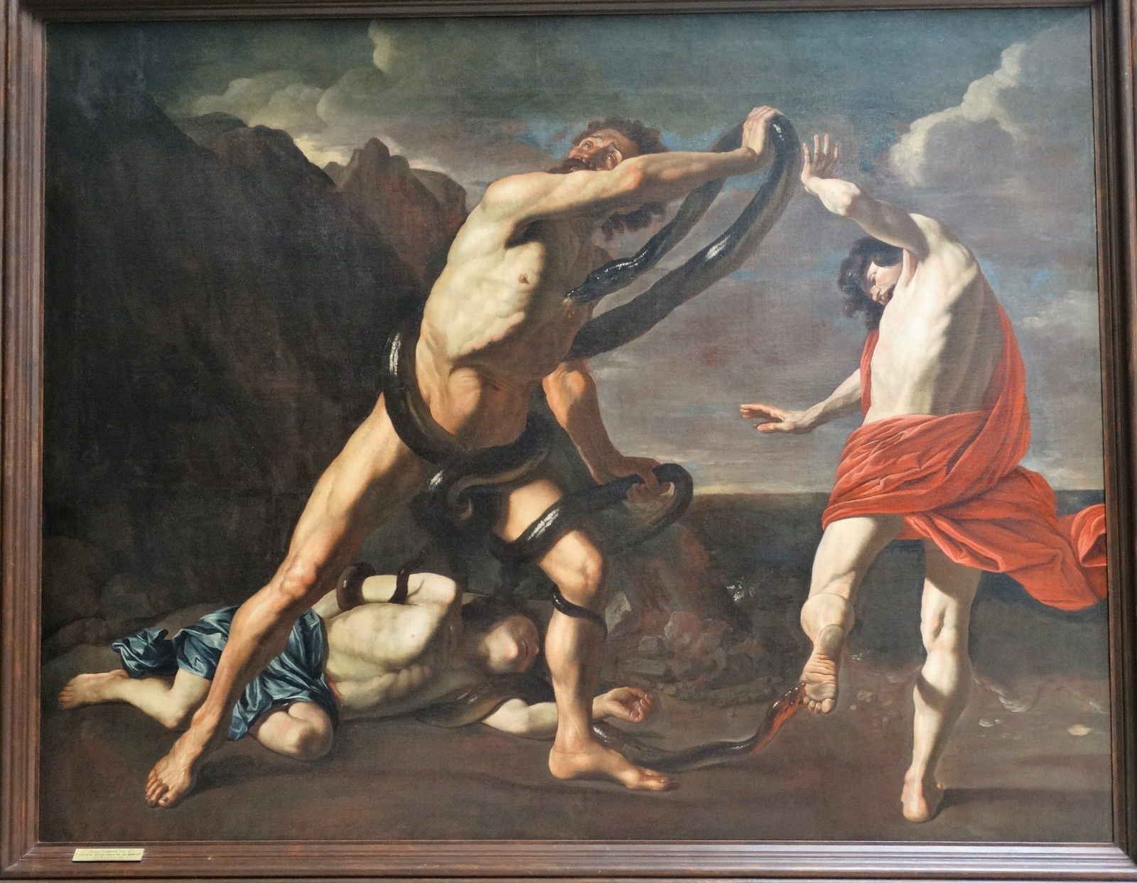 On voit que les peintres hollandais ne s'intéressaient pas qu'aux paysages mais aussi au scènes mythologiques. L'histoire de Laocoon et de ses fils est un épisode de l'Illiade de Homère, repris ensuite dans l'Enéide de Virgile. Laocoon est un prêtre troyen du culte de Poséidon qui enjoint les troyens de se méfier du cheval abandonné par les Grecs et de leur cadeau. Des serpents énormes alors arrivent de la mer et s'en prennent d'abord à ses fils qu'ils mordent et étouffent avant de s'en prendre au père qui arrive à leur secours, puis d'aller se lover aux pieds de la statue de la déesse Athéna dans son temple. Les Troyens ne se méfient plus du cheval et le font rentrer dans leur citée, signant sa destruction.